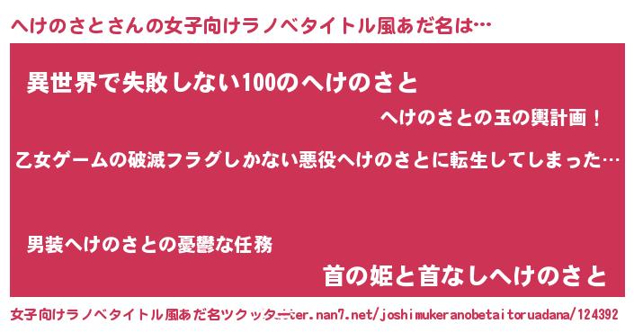 | 男性向けラノベタイトル風あだ名 | 『この素晴らしい世界にへけのさとを!』 |