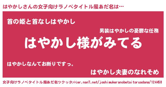 はやかしさんの女子向けラノベタイトル風あだ名は… 『はやかし様がみてる』『首の姫と首なしはやかし』『はやかし夫妻のなれそめ』 ツクッター #女子向けラノベタイトル風あだ名ツクッター http://tkutter.nan7.net/joshimukeranobetaitoruadana/124458/