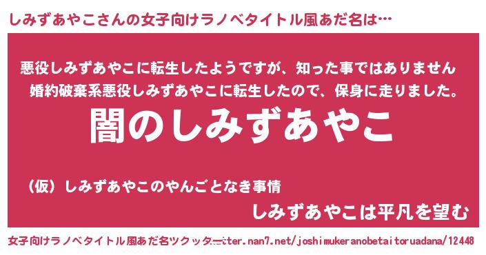 | 男性向けラノベタイトル風あだ名 | 『Re:しみずあやこから始める異世界生活』 |