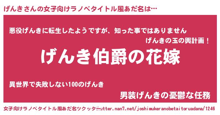 | 男性向けラノベタイトル風あだ名 | 『うちの娘の為ならば、俺はもしかしたらげんきも倒せるかもしれない。』 |