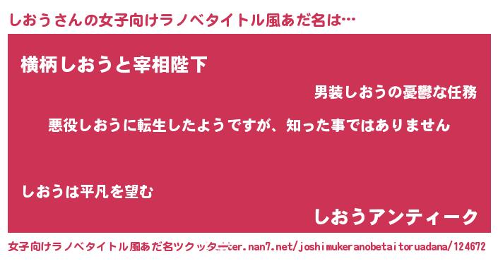 | 男性向けラノベタイトル風あだ名 | 『この素晴らしい世界にしおうを!』 |