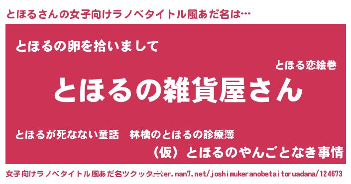 | 男性向けラノベタイトル風あだ名 | 『やはりとほるの青春ラブコメはまちがっている 』 |