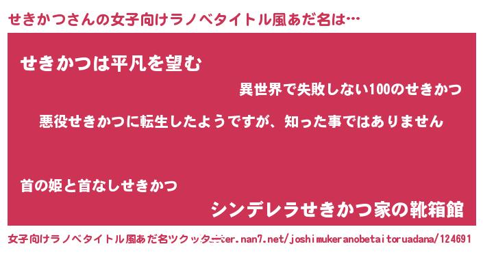| 男性向けラノベタイトル風あだ名 | 『この素晴らしい世界にせきかつを!』 |