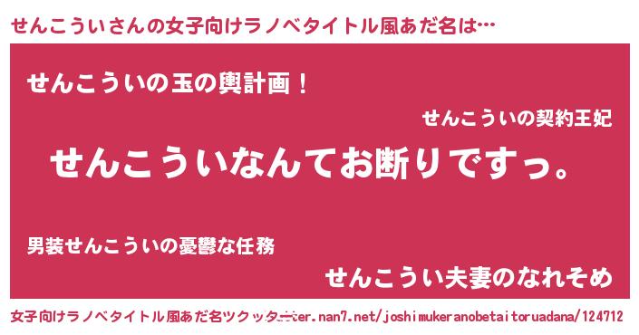 せんこういさんの女子向けラノベタイトル風あだ名は… 『せんこういなんてお断りですっ。』『せんこういの玉の輿計画!』『せんこうい夫妻のなれそめ』 ツクッター #女子向けラノベタイトル風あだ名ツクッター http://tkutter.nan7.net/joshimukeranobetaitoruadana/124712/