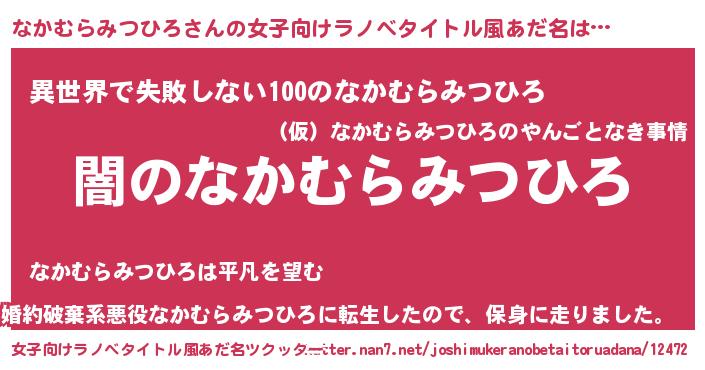 なかむらみつひろさんの女子向けラノベタイトル風あだ名は… 『闇のなかむらみつひろ』『異世界で失敗しない100のなかむらみつひろ』『婚約破棄系悪役なかむらみつひろに転生したので、保身に走りました。』 ツクッター #女子向けラノベタイトル風あだ名ツクッター http://tkutter.nan7.net/joshimukeranobetaitoruadana/12472/