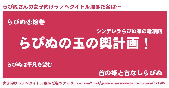 | 男性向けラノベタイトル風あだ名 | 『らぴぬ~年齢イコール彼女いない歴の魔法使い~』 |