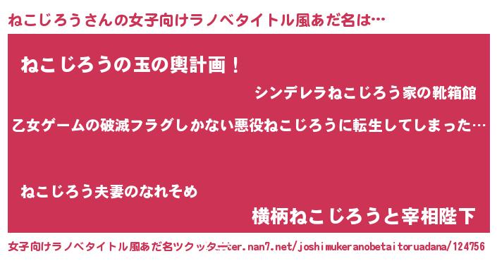 | 男性向けラノベタイトル風あだ名 | 『この素晴らしい世界にねこじろうを!』 |