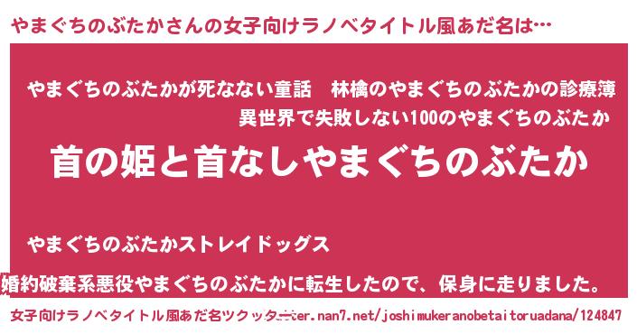 やまぐちのぶたかさんの女子向けラノベタイトル風あだ名は… 『首の姫と首なしやまぐちのぶたか』『やまぐちのぶたかが死なない童話 林檎のやまぐちのぶたかの診療簿』『婚約破棄系悪役やまぐちのぶたかに転生したので、保身に走りました。』 ツクッター #女子向けラノベタイトル風あだ名ツクッター http://tkutter.nan7.net/joshimukeranobetaitoruadana/124847/