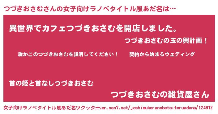 | 男性向けラノベタイトル風あだ名 | 『ツヅキオサムアートオンライン』 |