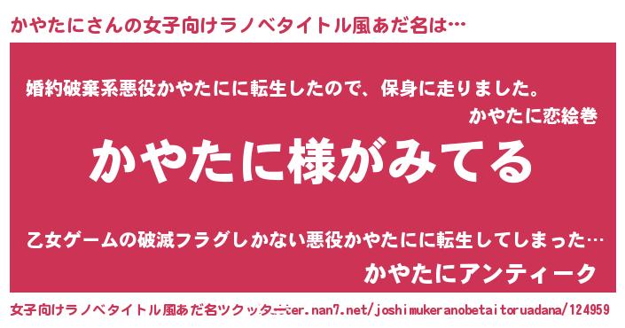 | 男性向けラノベタイトル風あだ名 | 『かやたにの嫁は女の子じゃないと思った?』 |