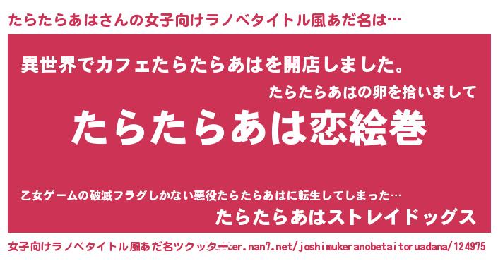 | 男性向けラノベタイトル風あだ名 | 『おまえをオタクにしてやるから、俺をたらたらあはにしてくれ! 』 |