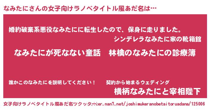 なみたにさんの女子向けラノベタイトル風あだ名は… 『なみたにが死なない童話 林檎のなみたにの診療簿』『婚約破棄系悪役なみたにに転生したので、保身に走りました。』『横柄なみたにと宰相陛下』 ツクッター #女子向けラノベタイトル風あだ名ツクッター http://tkutter.nan7.net/joshimukeranobetaitoruadana/125006/