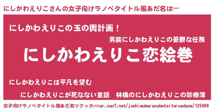 | 男性向けラノベタイトル風あだ名 | 『おまえをオタクにしてやるから、俺をにしかわえりこにしてくれ! 』 |