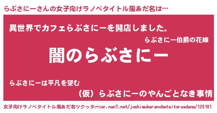 | 男性向けラノベタイトル風あだ名 | 『Re:らぶさにーから始める異世界生活』 |