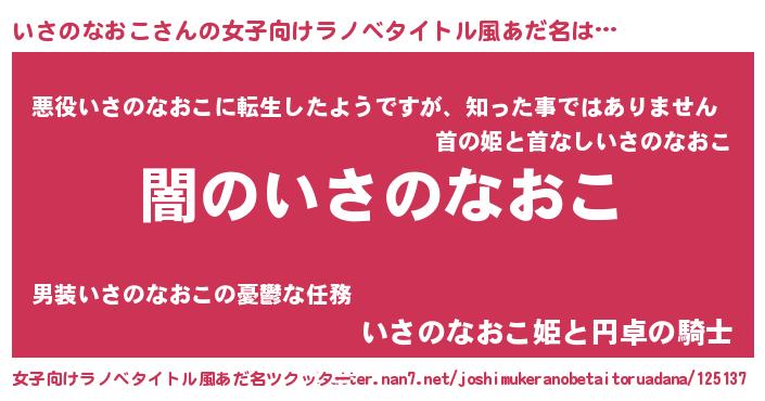 | 男性向けラノベタイトル風あだ名 | 『Re:いさのなおこから始める異世界生活』 |