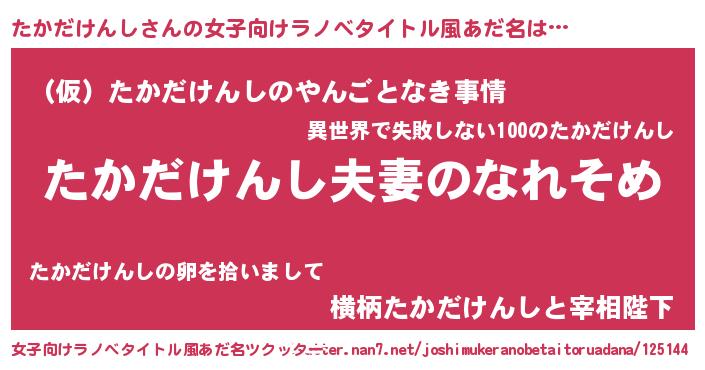 | 男性向けラノベタイトル風あだ名 | 『おまえをオタクにしてやるから、俺をたかだけんしにしてくれ! 』 |