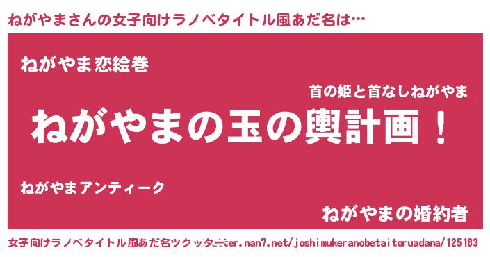 | 男性向けラノベタイトル風あだ名 | 『転生したらねがやまだった件』 |