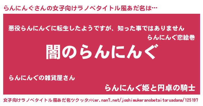 | 男性向けラノベタイトル風あだ名 | 『Re:らんにんぐから始める異世界生活』 |