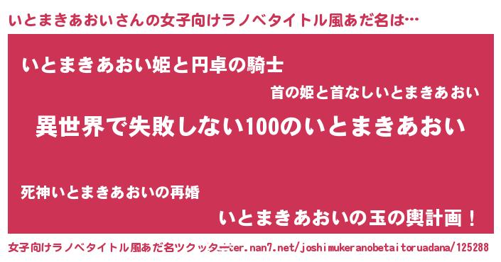 | 胡散臭い通販商品みたいなあだ名 | 『絶対に幸福をもたらす水素水…その名も「いとまきあおい」』 |