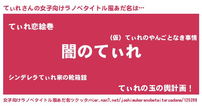 | 男性向けラノベタイトル風あだ名 | 『Re:てぃれから始める異世界生活』 |