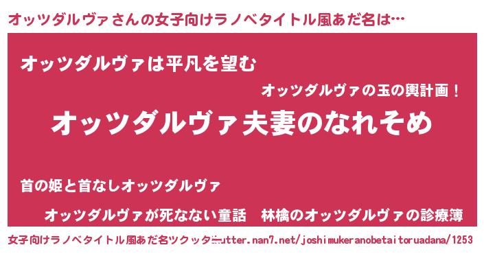 | 男性向けラノベタイトル風あだ名 | 『おまえをオタクにしてやるから、俺をオッツダルヴァにしてくれ! 』 |