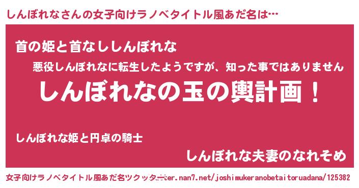 | 男性向けラノベタイトル風あだ名 | 『しんぼれな~年齢イコール彼女いない歴の魔法使い~』 |