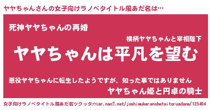 | 男性向けラノベタイトル風あだ名 | 『ダンジョンにヤヤちゃんを求めるのは間違っているだろうか』 |