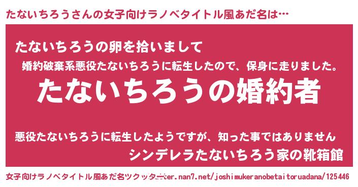 たないちろうさんの女子向けラノベタイトル風あだ名は… 『たないちろうの婚約者』『たないちろうの卵を拾いまして』『シンデレラたないちろう家の靴箱館』 ツクッター #女子向けラノベタイトル風あだ名ツクッター http://tkutter.nan7.net/joshimukeranobetaitoruadana/125446/