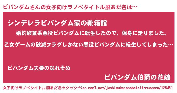 ビバンダムさんの女子向けラノベタイトル風あだ名は… 『乙女ゲームの破滅フラグしかない悪役ビバンダムに転生してしまった…』『シンデレラビバンダム家の靴箱館』『ビバンダム伯爵の花嫁』 ツクッター #女子向けラノベタイトル風あだ名ツクッター http://tkutter.nan7.net/joshimukeranobetaitoruadana/125451/