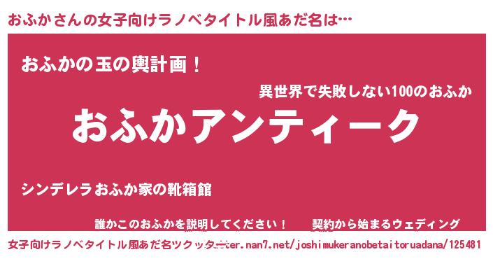 おふかさんの女子向けラノベタイトル風あだ名は… 『おふかアンティーク』『おふかの玉の輿計画!』『誰かこのおふかを説明してください! ~契約から始まるウェディング~』 ツクッター #女子向けラノベタイトル風あだ名ツクッター http://tkutter.nan7.net/joshimukeranobetaitoruadana/125481/