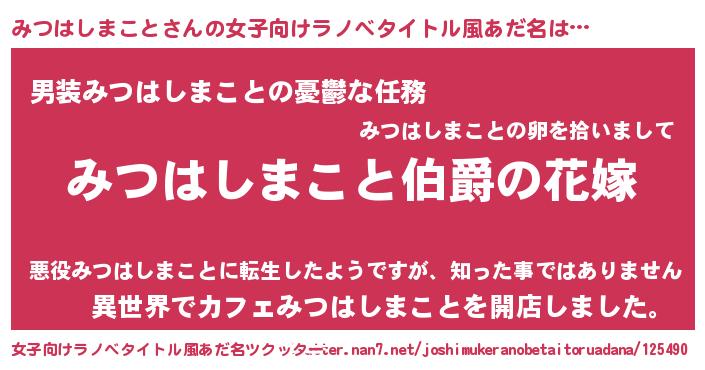| 男性向けラノベタイトル風あだ名 | 『うちの娘の為ならば、俺はもしかしたらみつはしまことも倒せるかもしれない。』 |