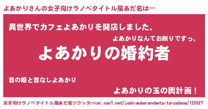 | 男性向けラノベタイトル風あだ名 | 『うちの娘の為ならば、俺はもしかしたらよあかりも倒せるかもしれない。』 |
