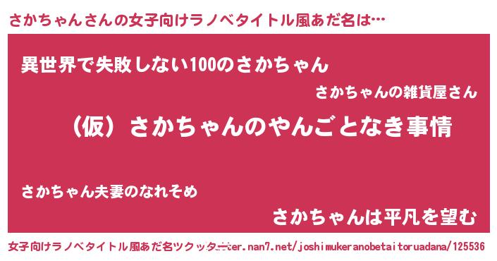 さかちゃんさんの女子向けラノベタイトル風あだ名は… 『(仮)さかちゃんのやんごとなき事情』『異世界で失敗しない100のさかちゃん』『さかちゃんは平凡を望む』 ツクッター #女子向けラノベタイトル風あだ名ツクッター http://tkutter.nan7.net/joshimukeranobetaitoruadana/125536/