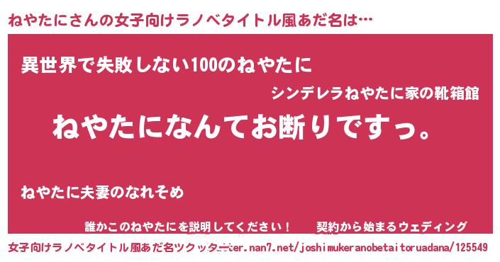 ねやたにさんの女子向けラノベタイトル風あだ名は… 『ねやたになんてお断りですっ。』『異世界で失敗しない100のねやたに』『誰かこのねやたにを説明してください! ~契約から始まるウェディング~』 ツクッター #女子向けラノベタイトル風あだ名ツクッター http://tkutter.nan7.net/joshimukeranobetaitoruadana/125549/