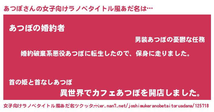 | 男性向けラノベタイトル風あだ名 | 『アツボスレイヤー』 |