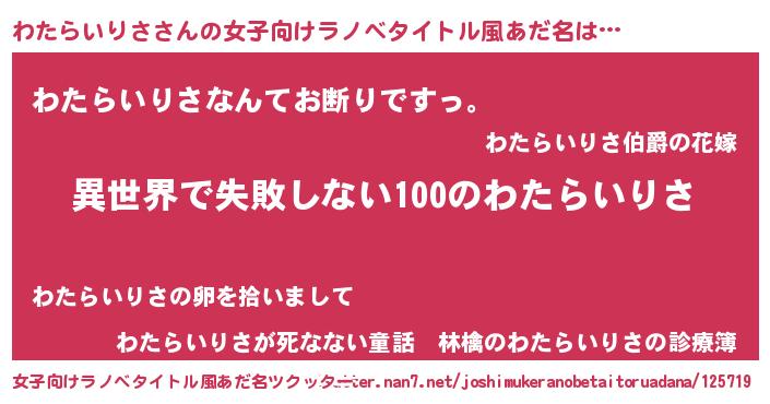 | 男性向けラノベタイトル風あだ名 | 『わたらいりさという概念が存在しない退屈な世界 』 |