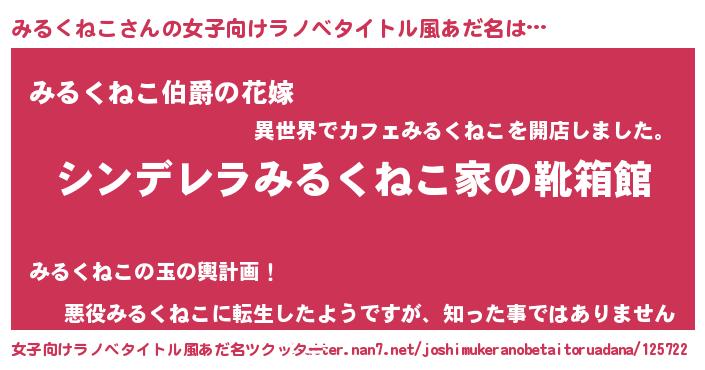 みるくねこさんの女子向けラノベタイトル風あだ名は… 『シンデレラみるくねこ家の靴箱館』『みるくねこ伯爵の花嫁』『悪役みるくねこに転生したようですが、知った事ではありません』 ツクッター #女子向けラノベタイトル風あだ名ツクッター http://tkutter.nan7.net/joshimukeranobetaitoruadana/125722/