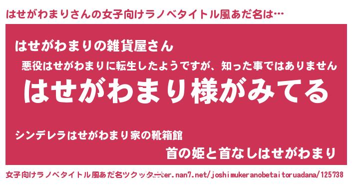 | 男性向けラノベタイトル風あだ名 | 『はせがわまりの嫁は女の子じゃないと思った?』 |