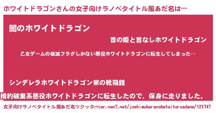 | 男性向けラノベタイトル風あだ名 | 『この素晴らしい世界にホワイトドラゴンを!』 |