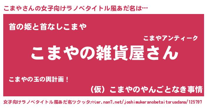 | 男性向けラノベタイトル風あだ名 | 『やはりこまやの青春ラブコメはまちがっている 』 |