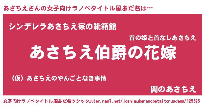 | 男性向けラノベタイトル風あだ名 | 『うちの娘の為ならば、俺はもしかしたらあさちえも倒せるかもしれない。』 |