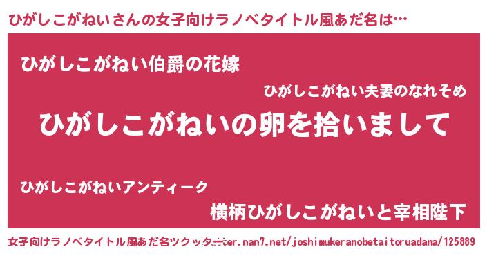 | 男性向けラノベタイトル風あだ名 | 『ひがしこがねいの嫁は女の子じゃないと思った?』 |