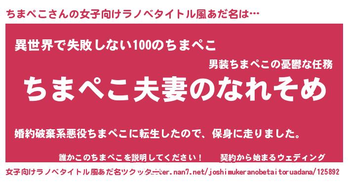 | 男性向けラノベタイトル風あだ名 | 『おまえをオタクにしてやるから、俺をちまぺこにしてくれ! 』 |