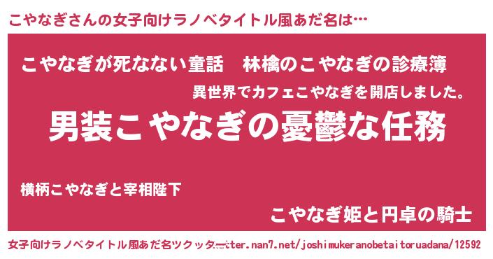 | 男性向けラノベタイトル風あだ名 | 『うちのこやなぎが世界を掌握している!』 |