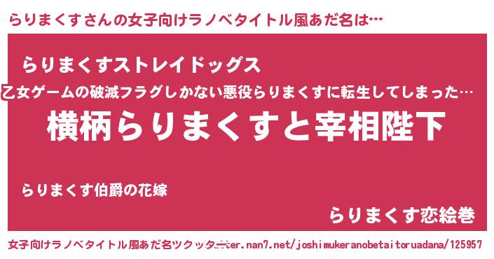 | 男性向けラノベタイトル風あだ名 | 『らりまくすに滅ぼされるだけの簡単なお仕事です』 |