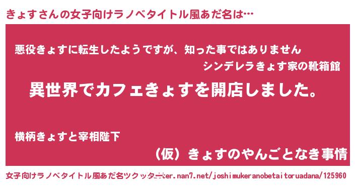 きょすさんの女子向けラノベタイトル風あだ名は… 『異世界でカフェきょすを開店しました。』『悪役きょすに転生したようですが、知った事ではありません』『(仮)きょすのやんごとなき事情』 ツクッター #女子向けラノベタイトル風あだ名ツクッター http://tkutter.nan7.net/joshimukeranobetaitoruadana/125960/