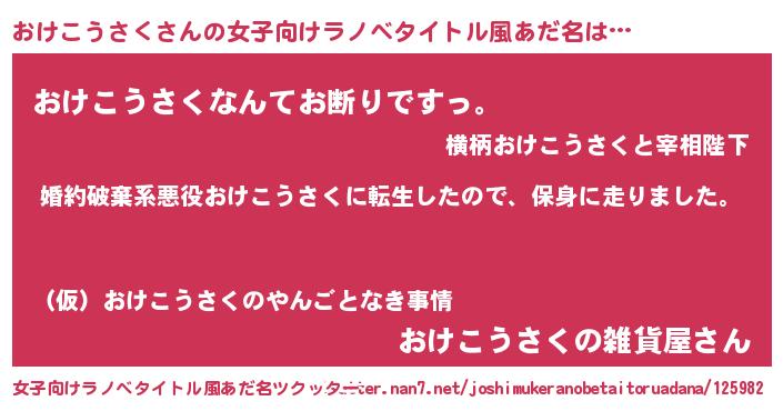 | 男性向けラノベタイトル風あだ名 | 『転生したらおけこうさくだった件』 |