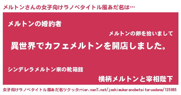 | 男性向けラノベタイトル風あだ名 | 『誰もが恐れるあのメルトンが、ぼくの専属メイドになるようです。』 |