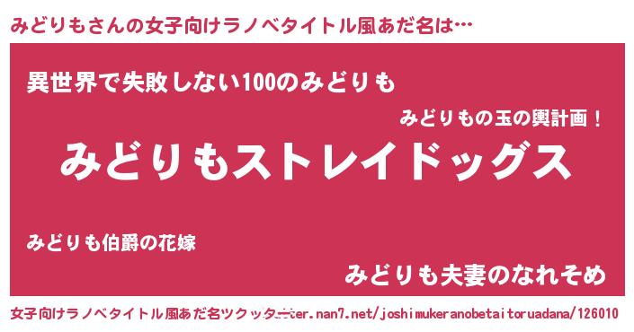 | 男性向けラノベタイトル風あだ名 | 『Re:みどりもから始める異世界生活』 |