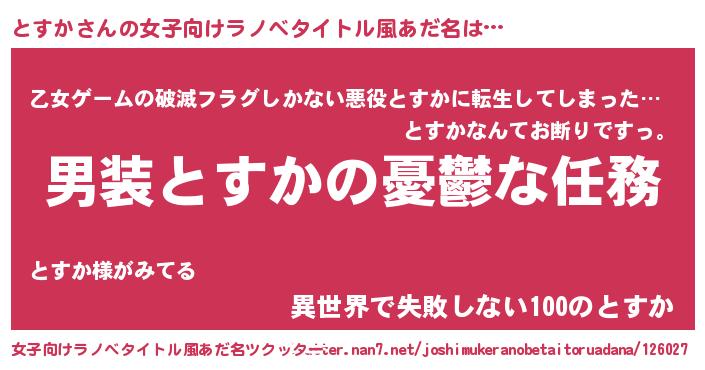 | 男性向けラノベタイトル風あだ名 | 『うちのとすかが世界を掌握している!』 |